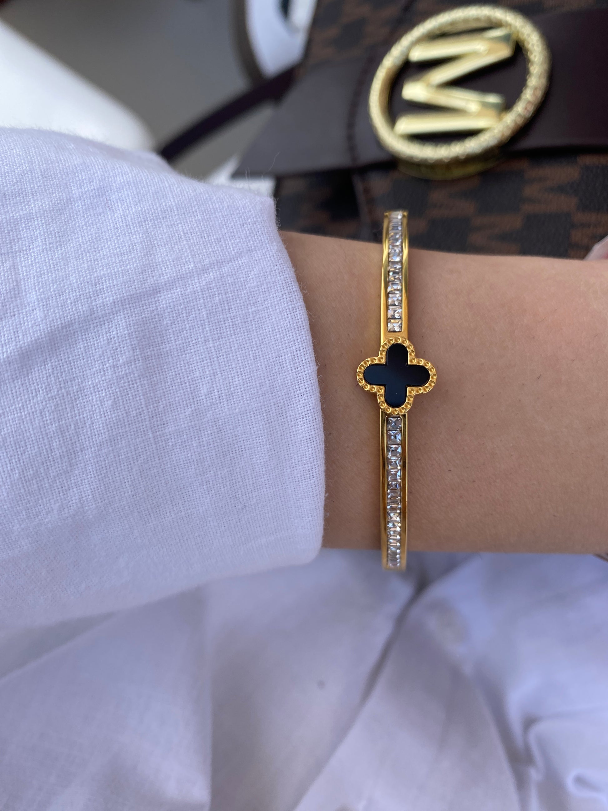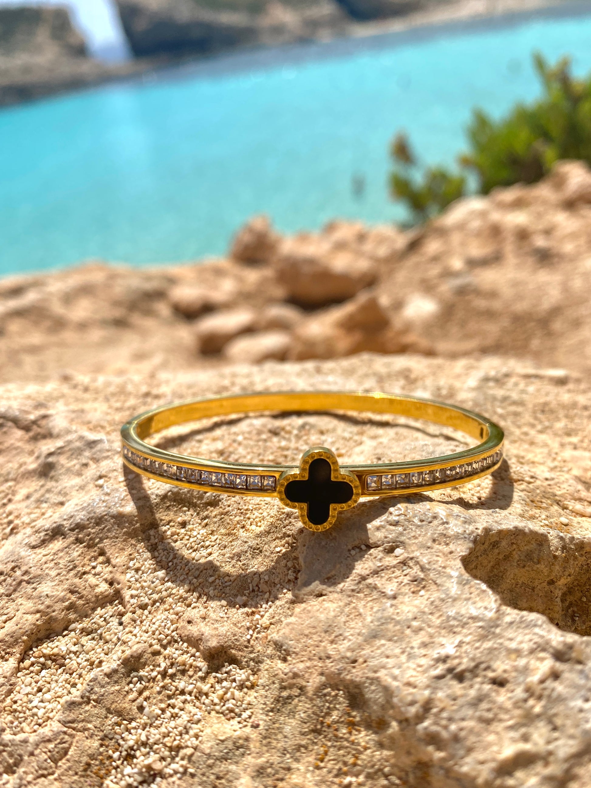 Lucky Leaf – Luxus ist ein elegantes Armreif aus hochwertigem Edelstahl mit einer langlebigen 18K-Vergoldung. Das stilvolle Design kombiniert zeitlose Eleganz mit einem eleganten schwarzen Kleeblatt in der Mitte des Armreifs. Funkelnde Zirkonia Steine verleihen dem Schmuckstück einen luxuriösen Glanz.
